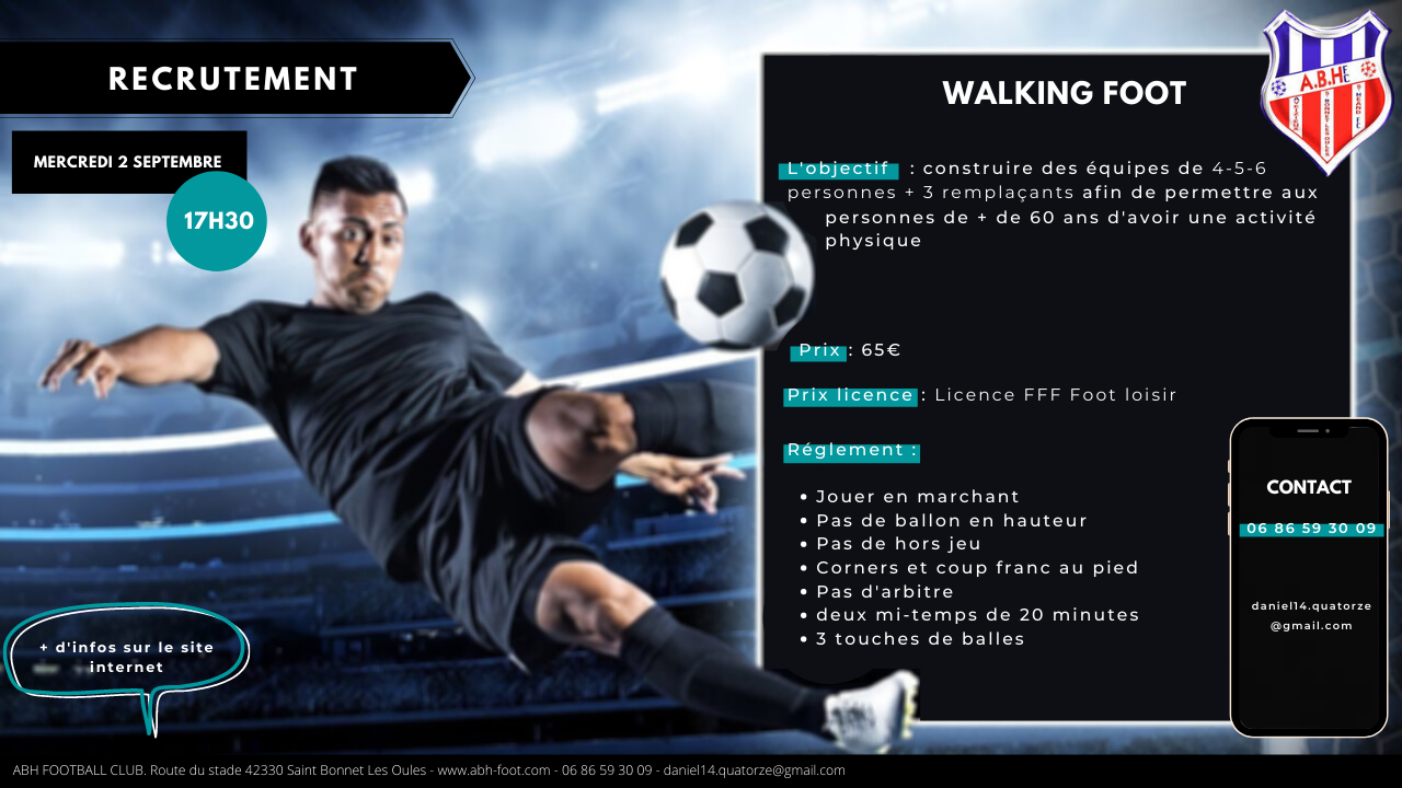 Mercredi 2 septembre (début de l'essai 17H30) : ABH propose un essai du concept du walking football sur la pelouse du bas de Saint-Bonnet-Les-Oules.