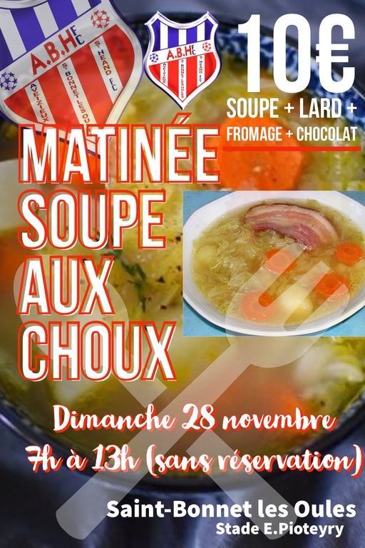 Nous organisons notre mythique "Soupe au choux" de Bernard le dimanche 28 novembre au stade E.Pioteyry à St Bonnet les Oules.