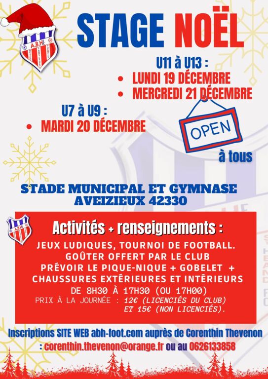 ABH Foot organise des Stages pour les vacances de noël dirigés par Corenthin Thevenon. Ces derniers auront lieu sur la journée de 8h30 à 17h30 sur le complexe de Saint-Héand.