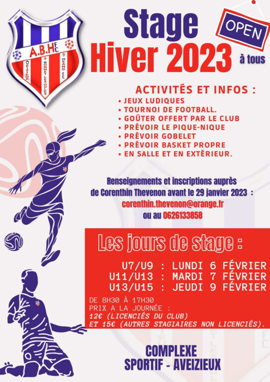 ABH Foot organise des Stages pour les vacances de noël dirigés par Corenthin Thevenon. Ces derniers auront lieu sur la journée de 8h30 à 17h30 sur le complexe d'Aveizieux.
