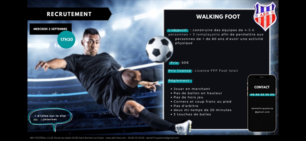 ABH souhaite répondre à votre besoin en créant une équipe de foot en marchant. Plus d'information sur le projet ci-dessous.